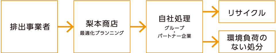 梨本商店では独自の廃棄物処理/リサイクル業者ネットワークの中から、お客様の処分ニーズにマッチし、自社処理または最も良い条件で請け負ってくれる業者を選定し、最適化プランニングを実施しています。